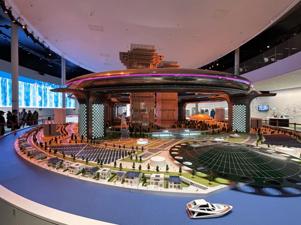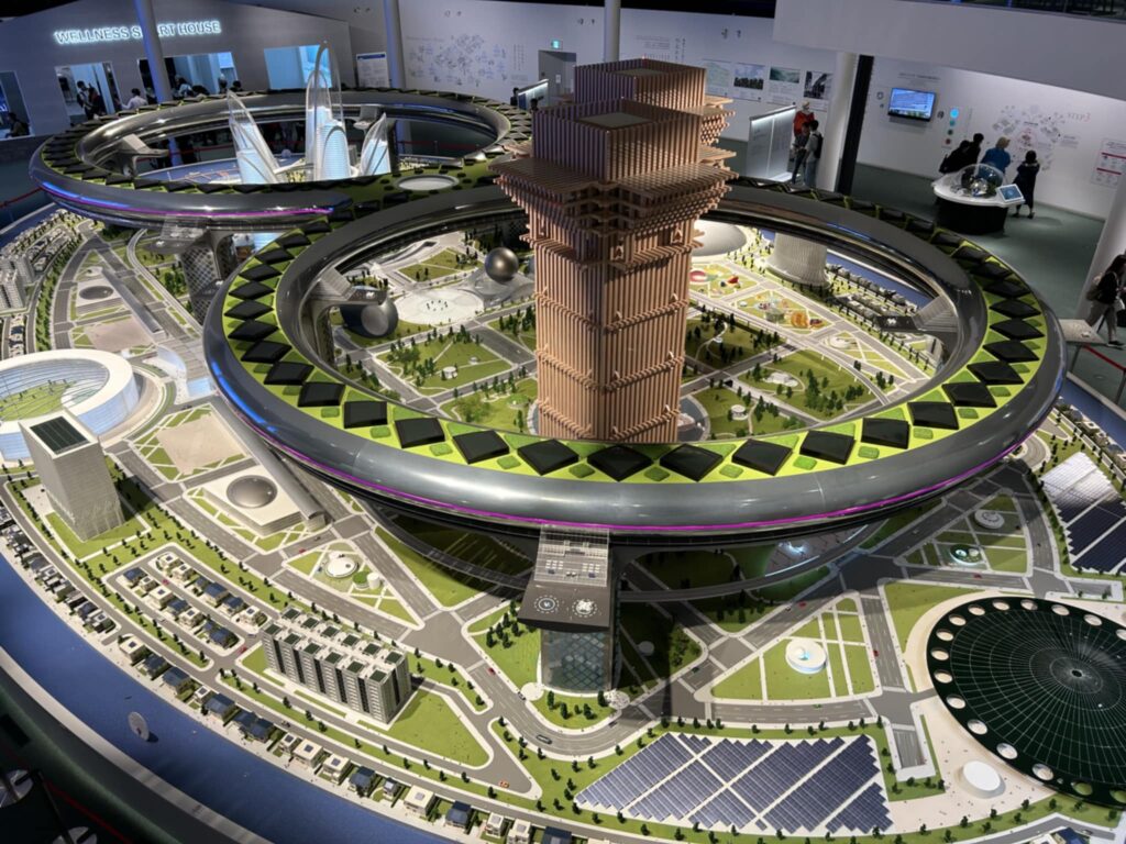 パビリオンの中心には、「ウェルネス・スマートシティ」を象徴する巨大なジオラマが展示されていました。特に目を引いたのは、木造の超高層ツインタワーです。これは、CLT(直交集成板)などの先進的な木質材料とハイブリッド構造によって、超高層建築の新たな可能性を示しており、環境に優しく温かみのある住まいが未来を拓くことを実感しました。